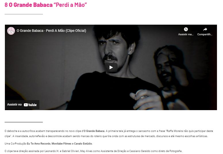 Lista do site Hits Perdidos anunciando o clipe "Perdi a Mão" do grupo "O Grande Babaca", produzido pela Movilabe Filmes em parceria com o selo Eu Te Amo Records como um dos melhores clipes do mês de Janeiro 2020.
